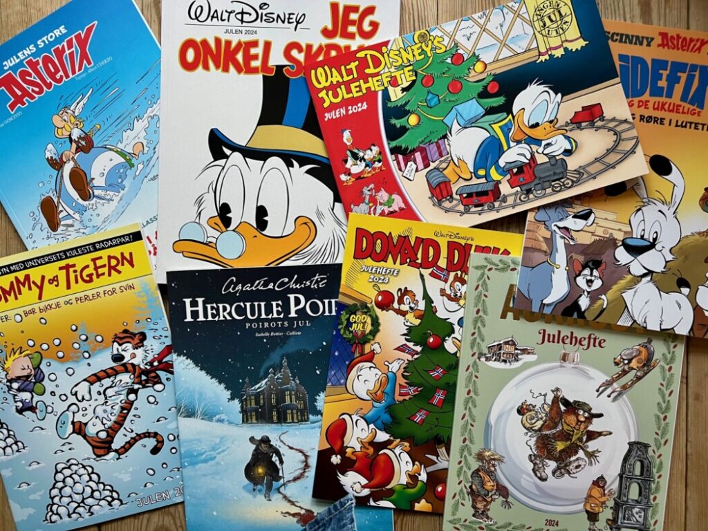 Så er vi der igjen. Med under to uker til julaften drar det seg til med innkjøp og forberedelser, og butikkenes bladhyller bugner av julehefter. Som alltid produseres altfor mange – her er mye ræl – men som alltid produseres også mye bra. Uheldigvis ligger det i juleheftenes natur at mye av materialet som tilbys er resirkulert. Gamle søndagssider fra amerikanske aviser med serier som Blondie, Fiinbeck og Fia, Knoll og Tott og Billy er riktignok på vikende front – kan det virke som – og veien har åpnet seg for norske kvalitetsserier og mye annet rart. Blant årets utgivelser finnes eksempelvis et satiremagasin med tegneserier om Donald Trump og Jul under krigen redigert av Petter Schjerven, for å ha nevnt to av de mer uvanlige. I tillegg kommer selvfølgelig Herborg Kråkeviks årvisse Juleroser og lignende julehefter med noveller og dikt og petiter og sanger og jeg vet ikke hva, som fortrinnsvis er ment å være til ettertanke.