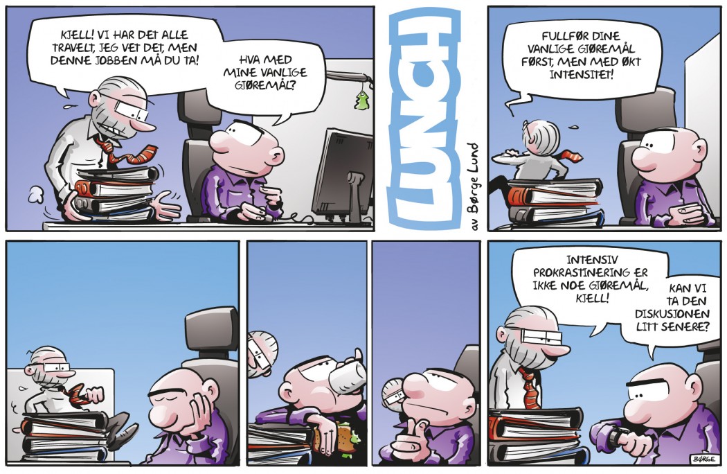 «Vi trenger alle noe å tro på, selv om vi innerst inne vet at det bare er bullshit.» I årets Lunch-julehefte har Børge Lund laget en 29 sider lang spesialhistorie som bryter betydelig med de vanlige stripene. Som alltid gir det større formatet anledning til å fortelle bredere og mer dvelende, ettertenksomt, noe som kler juletematikken godt. På grunn av dyrtid og sviktende økonomi står julebordet i fare i det navnløse firmaet der Kjell og de andre jobber, eller som han sier når han tar det i seg, der de har «vært på jobb» hele året. Det er ikke helt det samme, særlig ikke i hans tilfelle. Men så ser det ut til å bli julebord likevel, eller mer presist «tidenes feteste juletur» til der den ekte julenissen bor, i regi av det mystiske firmaet Dreamtravel. Her er ikke alt som det skal, og Kjell avdekker svindelen. At det er akkurat han som lukter lunta er heller ikke så underlig, skal det vise seg. Historien har også en gjesteopptreden fra Kjells foreldre. Stas!