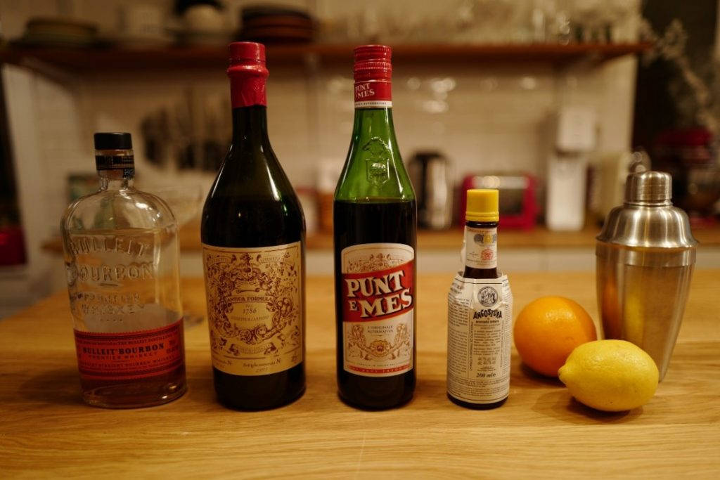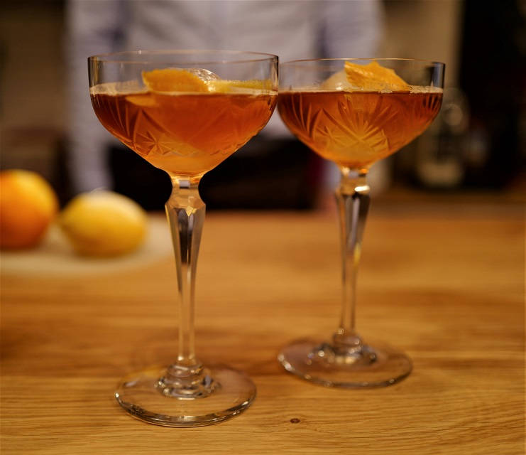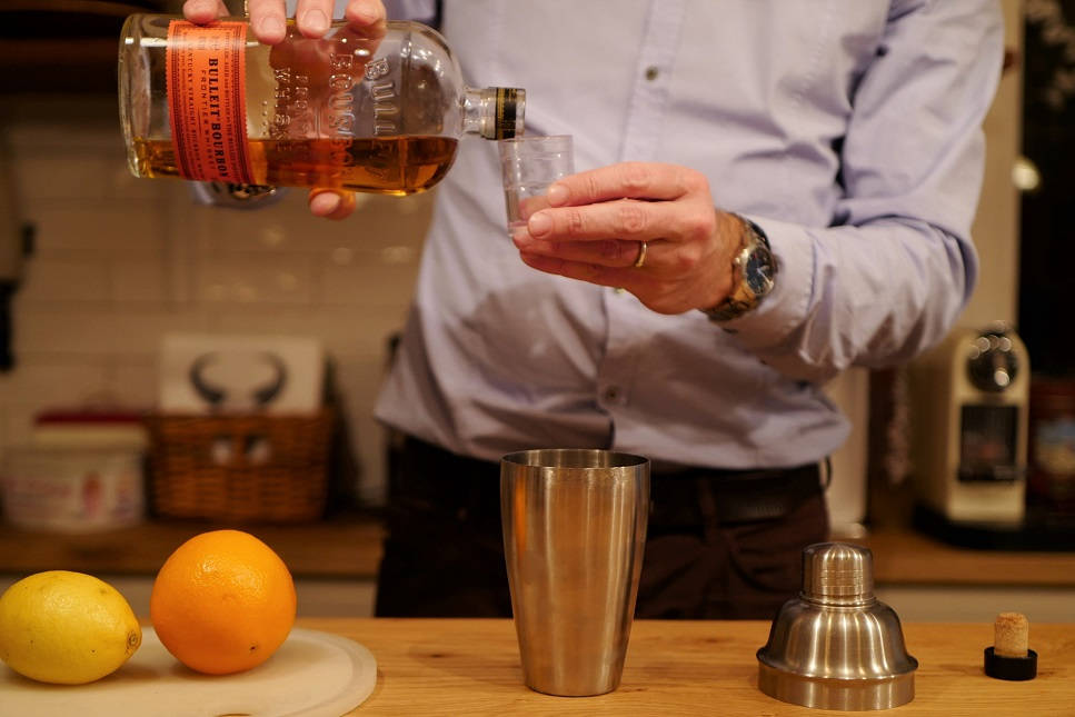 Alt blandes i en shaker med fem-seks isbiter. Rist godt og sil over i et lite cocktailglass eller en liten champagneskål. Pynt med en stripe sitronskall og en stripe appelsinskall, og hvis du vil kan du også ha i en stor isbit. Det er en alkoholsterk cocktail, men bourbonen balanseres fint av bitterstoffene og er rund i all sin fylde.