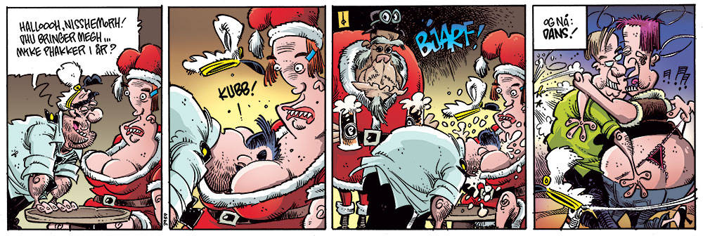 Det er dog så uendelig mye mer å gapskratte av i denne boken og i serien både før og etter. Pondus (tegneserien) er totalt uforutsigbar i den forstand at vitsene kan komme fra alle kanter, også der du minst venter det, og en enkelt stripe inneholder ofte dobbeltpoenger, altså at når du tror Frode har trøkket til med punchlinen, så kommer det enda en, hakk i hæl. For ikke å snakke om timingen. Ingen serietegnere, og da mener jeg INGEN, mestrer timing så godt som Frode. Og noen ganger er det bare tegningene i seg selv som er det avgjørende, som i denne lune julestripen der en riktig så grisedrita Ivar går, for å si det forsiktig, litt over streken. Det er en av de morsomste Pondus-stripene jeg kan huske å ha lest, og jeg har lest alle. Mange ganger. Og ledd. Veldig mye.