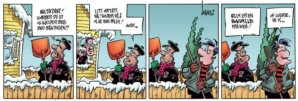 Men altså, Tito og Baltazar. To skruller om det noensinne fantes noen, og bare navnene deres er morsomme, «typiske homonavn», ifølge Tore Bjørkeli som har skrevet en artikkel om duoen i den nye boken. Som faste Pondus-lesere vil vite er Eliteserien den kronologiske samlingen av striper og ekstramateriale helt fra den spede starten i 1995, og den nye boken tar oss til årene 2012 og -13. Det betyr at Tito og Baltazar for lengst har gjort sitt inntog som Pondus’ naboer etter at gamle major Hylse flyttet ut så tidlig som i 2003. Det finnes knapt den ydmykelse de (og Pondus) ikke allerede er blitt utsatt for, men det er like morsomt å følge med på nye, som i den aktuelle stripen jeg innledningsvis siterte fra og som du kan lese her: