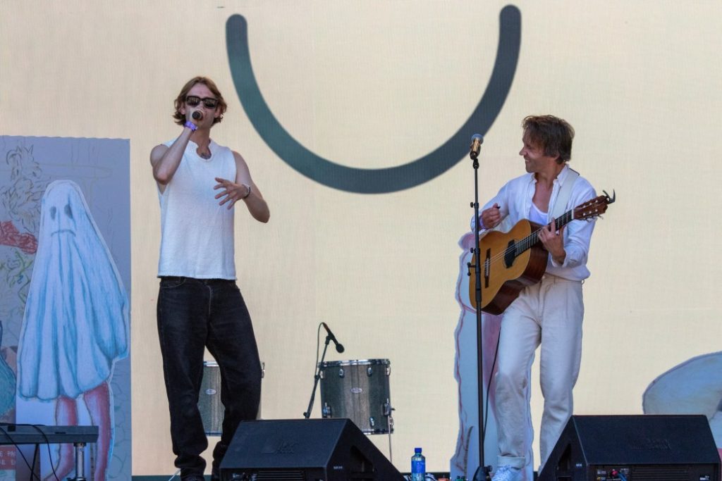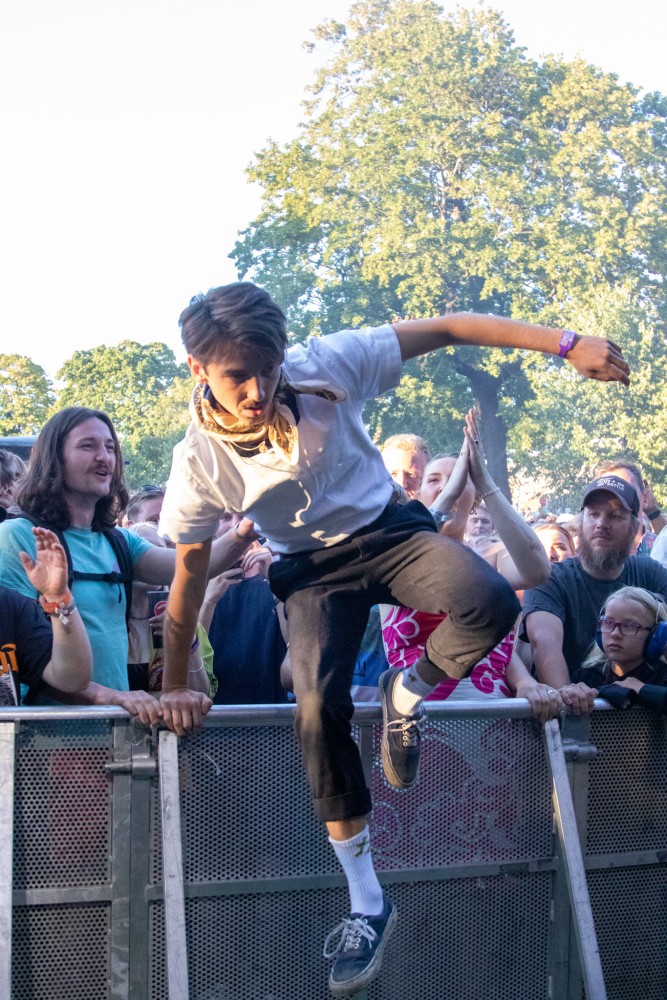 Senere i går, mens solen gjør seg klar til å gå ned ute i Oslofjorden, står Edvard Valberg og de fire andre medlemmene i Honningbarna skjult i publikumsmengden foran Vindfruen-scenen, og når klokken viser 20:00 bykser de opp på scenen og gjennomfører det kuleste og mest halsbrekkende showet jeg har sett på Øya siden forrige gang de spilte her, i 2018 (tror jeg), da Edvard hadde gipset det ene benet uten at det forhindret ham i å klatre høyt opp i scenerigget og kaste seg ut til publikum.