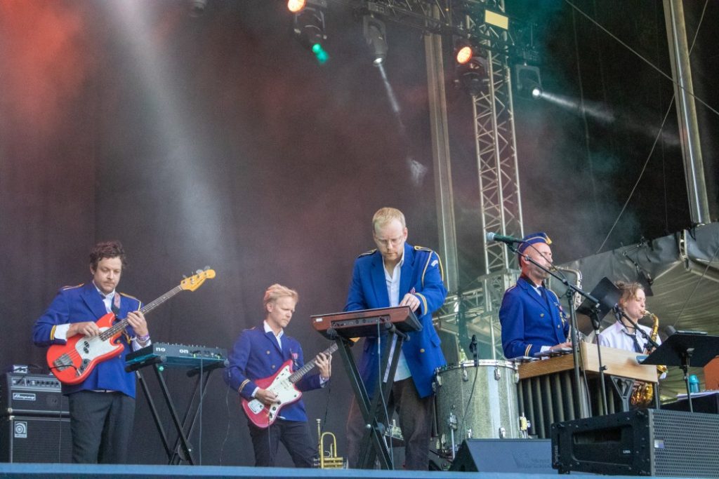 Skarbø Skulekorps ligner ikke på så mye annet. Det er riktignok et fiktivt skolekorps, unnskyld, skulekorps, men de er kledd i fine blå uniformer og har en fin, hjemmesydd fane som står utstilt på scenen, mens de spiller sin unike blanding av jazz, afrobeat og mye mer, kort fortalt korpsmusikk du aldri har hørt maken til.