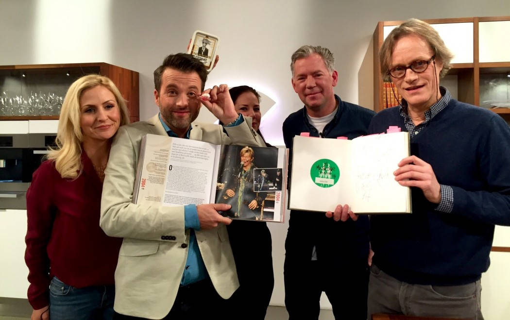 Programleder Peter Moi Bubresko viser frem kjærligheten som traff David Bowie i øyet for 12 år siden. TIl venstre i bildet medprogramleder Cathrine Fossum, Inger-Lise Størksen delvis skjult, meg og Jørgen Roll. Foto: TV2