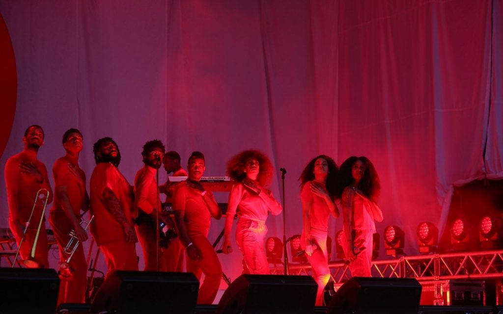 Her er ingenting overlatt til tilfeldighetene, og scenografi, koreografi og timing er hele veien utsøkt, til fingerspissene perfekt. «Backdropet» på scenen er enkel: En stor rød sirkel plassert mot hvit bunn, som det japanske flagget, men når mørket senker seg og lysene kommer på blir det hvite borte, erstattet av nyanser i rødt, lilla og blått. Bandet og sangerne/danserne kommer ut en etter en, alle kledd helt i rødt, og så kommer stjernen selv, like rødkledd og med sin enorme velfriserte afro og et kjempestort smil til alle som har kommet for å se henne og venter i duskregnet. Hun åpner med et subtilt brak, og vi får «Rise», «Weary» og «Cranes In The Sky», den strålende åpningstroikaen fra fjorårets glitrende album A Seat At The Table. Selv om det også blir dansefest med «Some Things Never Seem To Fucking Work» og «Losing You» fra den Dev Hynes-produserte EPen True er dette først og sist en musikalsk Black History Month gjennomført på en time.