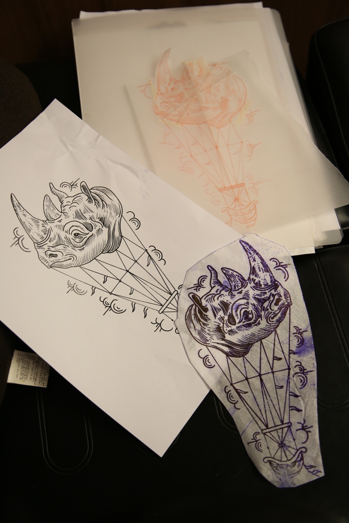 Basert på en tegning jeg hadde funnet på nettet med et neshorn hengende i en luftballong skisset han opp et motiv der neshornets hode var selve ballongen. Dødskult, og vi gikk for det, på nederste innside av høyrearmen. Det sved som pokker, men resultatet ble utrolig vellykket, og det tok ikke lenger tid enn halvannen time å fullføre jobben. Fornøyd nå, så får vi se hva som skjer neste sommer. Det er ikke godt å vite, men det kan nok bli en til…