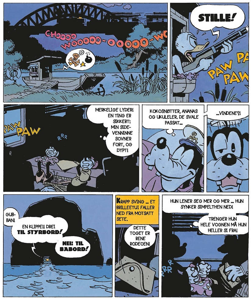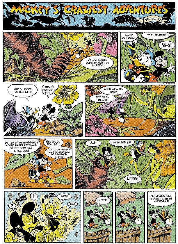 Mickey’s Craziest Adventures er noe helt annet. Her har den franske manusforfatteren med det oppsiktsvekkende kunstnernavnet Lewis Trondheim (egentlig heter han Laurent Chabosy) og tegneren Nicolas Keramidas (også fransk) skapt en ellevill og hesblesende fortelling med Mikke og Donald i hovedrollene, basert på fiktive amerikanske tegneserieblader de har funnet på et loppemarked og «som var gått fullstendig i glemmeboken», får vi vite.